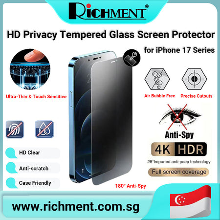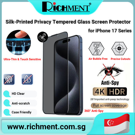 【✅SG Brand🔥】RICHMENT Silk-Printed Privacy Tempered Glass Screen Protector for iPhone 17 / 17 Plus / 17 Pro / 17 Pro Max – 9H Hardness, Anti-Spy, HD Clear, Scratch Resistant, Case Friendly, Face ID Compatible, Anti-Fingerprint, Smooth Touch, Full Coverage