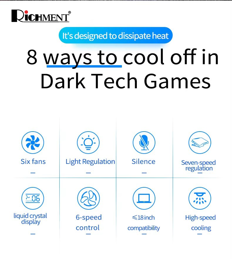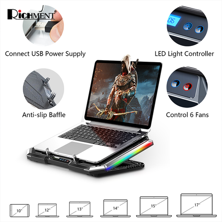 【✅SG Brand🔥】RICHMENT Q8 ICE COOREL Laptop Cooling Pad with 6 Cooling Fans, Cooling Pad for Laptop Fan 12-17.3 Inch, Laptop Cooler Stand with 6 Height Adjustable, Notebook Cooler Pad with Two USB Port