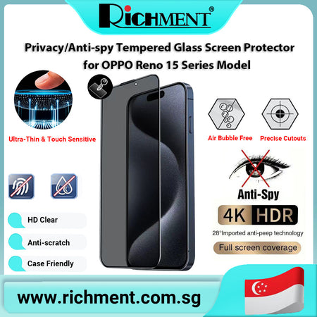 【✅SG Brand🔥】RICHMENT Silk-Printed Privacy Tempered Glass Screen Protector for OPPO Reno 15/15C/15 Pro/15 Pro Max– 9H Hardness, Anti-Spy, HD Clear, Scratch Resistant, Case Friendly, , Anti-Fingerprint, Smooth Touch, Full Coverage