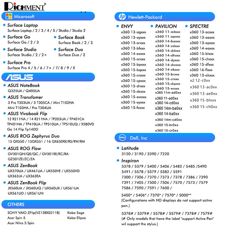 - Stylus Pen for Microsoft Surface, HP Envy/Pavilion/Spectre, ASUS ZenBook/VivoBook, Dell Inspiron/Latitude, Sony VAIO, Kobo Sage/Elipsa