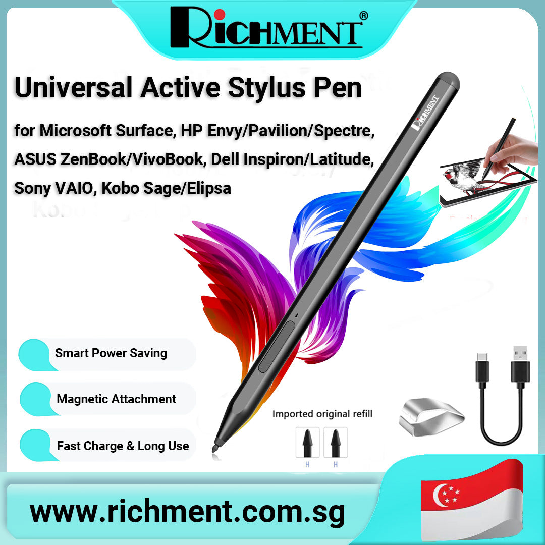 【✅SG Brand🔥】RICHMENT Stylus Pen for for Microsoft Surface, HP Envy/Pavilion/Spectre, ASUS ZenBook/VivoBook, Dell Inspiron/Latitude, Sony VAIO, Kobo Sage/Elipsa, 4096 Pressure Sensitivity, Tilt Function, Magnetic Attach