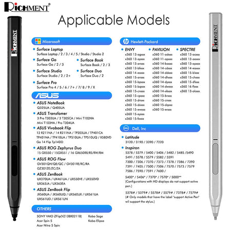 • Stylus Pen for Microsoft Surface, HP Envy/Pavilion/Spectre, ASUS ZenBook/VivoBook, Dell Inspiron/Latitude,  Sony VAIO, Kobo Sage/Elipsa