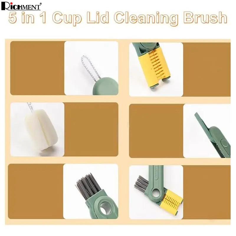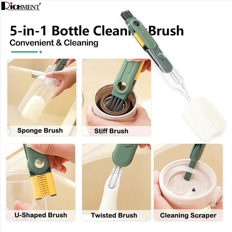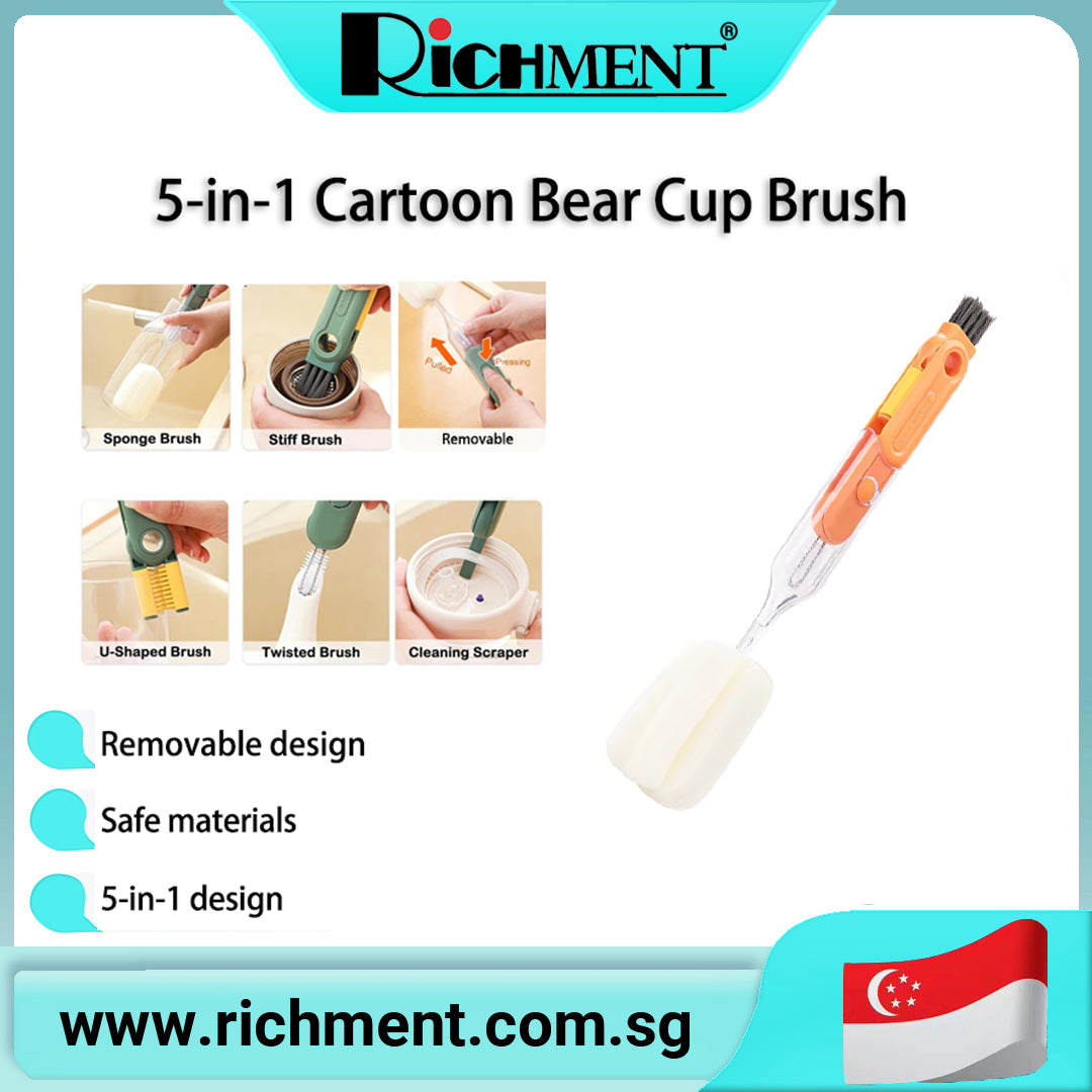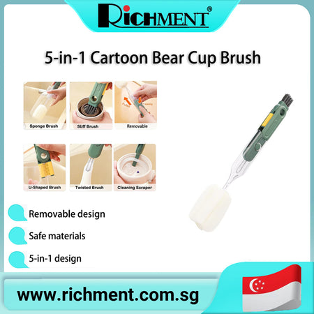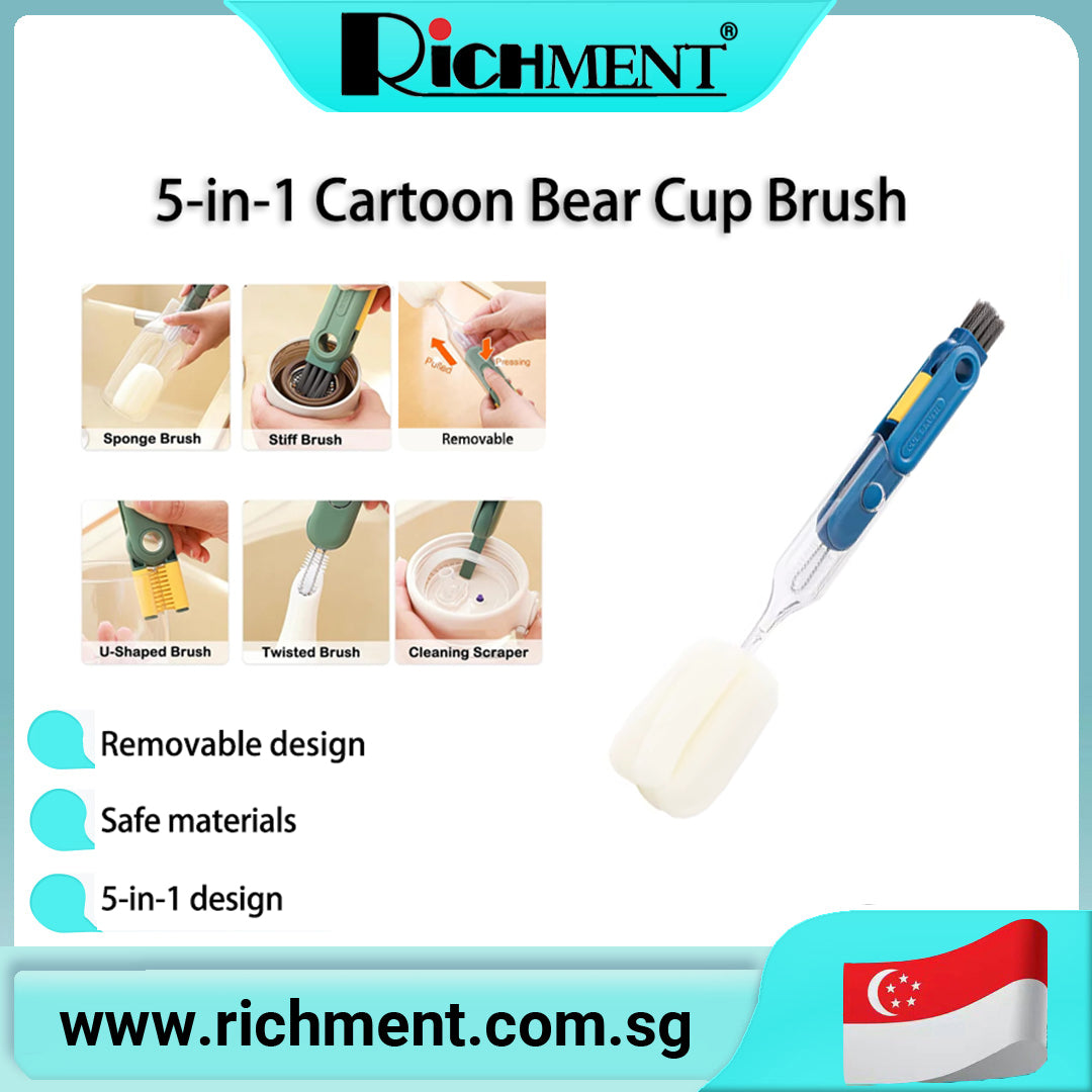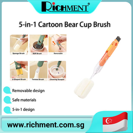 【✅SG Brand🔥】RICHMENT 5 in 1 Bottle & Cup Cleaning Brush Set with Sponge Brush, Stiff Brush, U Shaped Brush, Twisted Crevice Brush & Scraper for Cups, Lids, Bottles and Narrow Gaps
