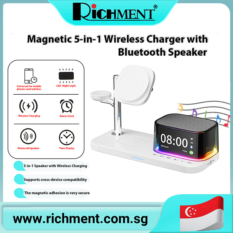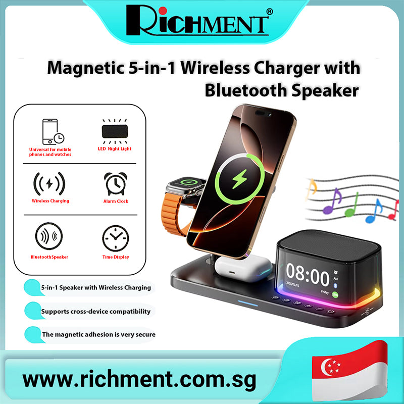 【✅SG Brand🔥】RICHMENT Portable Multi functional Wireless Charging Stand 5-in-1 Wireless Charger Qi2.2 Magnetic 25W with Bluetooth Speaker Golf, Beach, Homeware, Travel, Gift Ideas
