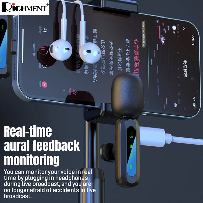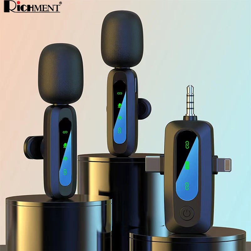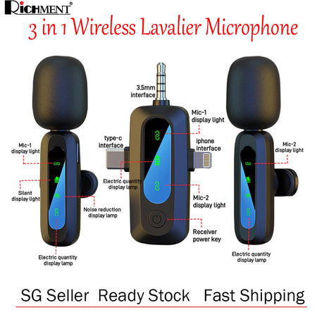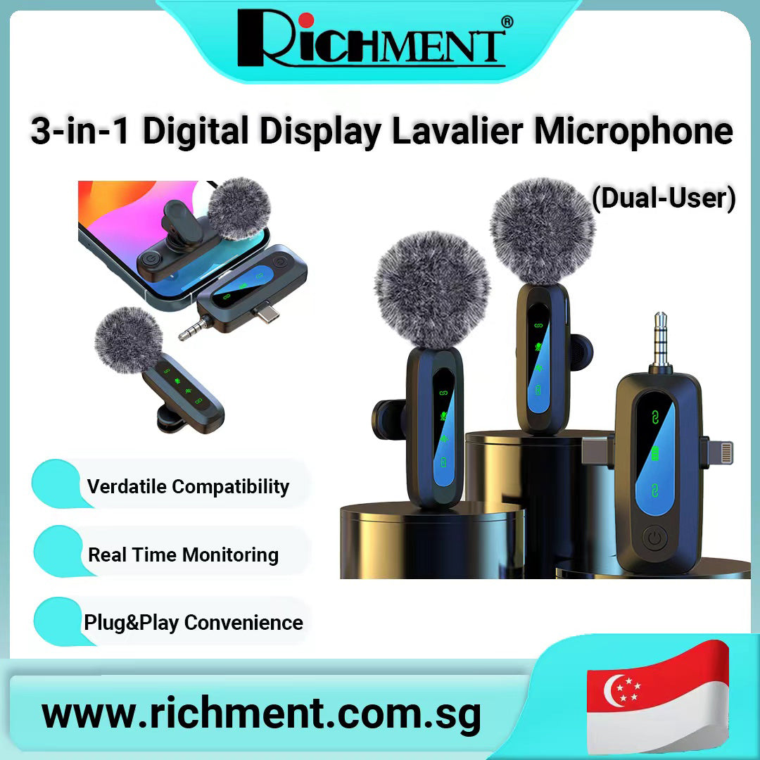 【✅SG Brand🔥】RICHMENT 3-in-1 Wireless Lavalier Microphone with Digital Display & Furry Windshield for iPhone/Android/Camera, Noise Cancelling, Plug & Play, for Vlogging, Live Streaming, Recording