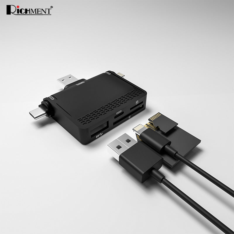 - Upgrade your mobile and desktop data experience with this multifunctional 4-in-1 USB OTG Card Reader and Expander. Designed for ultimate versatility, it supports Lightning, Type-C, Micro USB, and standard USB interfaces – making it perfect for iPhones, Android phones, iPads, laptops, and desktops.